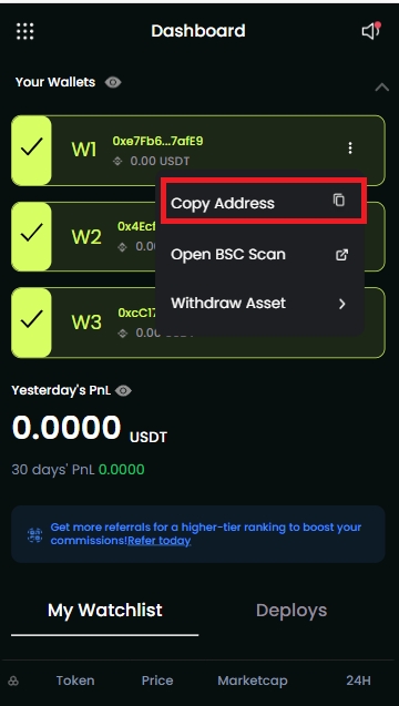 转到您的任何一个钱包,粘贴您复制的地址,然后向Coribot钱包充值至少0.1 BNB。